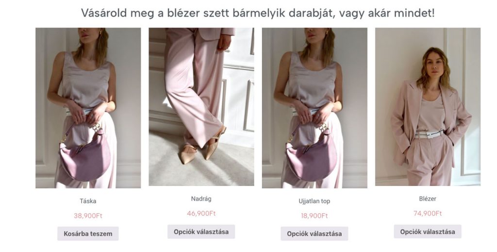 Ebben a konkrét esetben végül kiderült, hogy erre nincsen szükség. Elég ha létrehozunk termék landing oldalakat (sima WordPress aloldal) Ezeken a termék aloldalakon a felső részben elhelyezzük a look képeket és a look leírását. A leírás alatt pedig Elementor Pro segítségével egyesével behelyezzük a look-hoz kapcsolódó termékeket. Az Elementor Proval simán be tudunk tenni egyszerű és variálható termékeket is bármilyen WordPress aloldalra. Van lehetőség arra is, hogy gyors kosár gombot tegyünk, amivel a vásárló a részletek megtekintése nélkül is be tudja tenni a terméket a kosárba. És van lehetőség arra is, hogy gyorskosár nélkül a látogató átkattintson a termék aloldalára és onnan vásárolja meg.